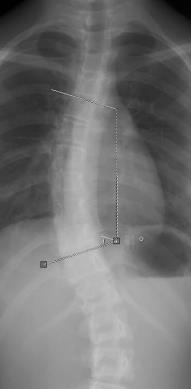 - Click the starting point of the second line and drag to the second end point. A dotted line connects the two line and calculates the angle (Cobb angle) between them.